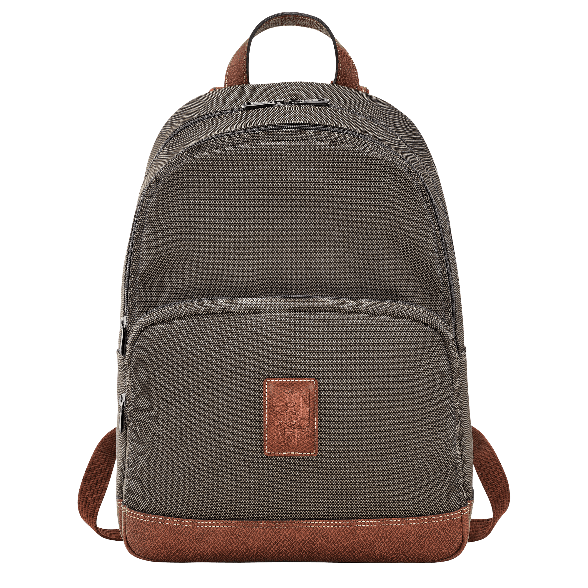 This bag boasts ample space and practicality while maintaining an elegant style, embodying the essence of hiking backpack design. It features two external pockets, emphasizing understated elegance. The collection includes simple designs paired with a Longchamp rectangular leather embossed logo and contrasting stitching, showcasing refined and elegant style. The canvas is adorned with two-tone Russian leather trim, fully displaying a rich three-dimensional effect.